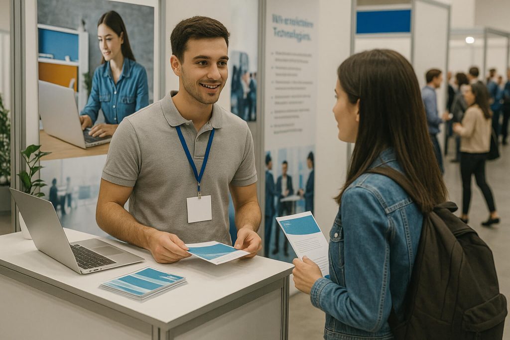 - Individuelles Branding der Ausstellerfläche möglich (z. B. Logos, Rollups, Infomaterial)